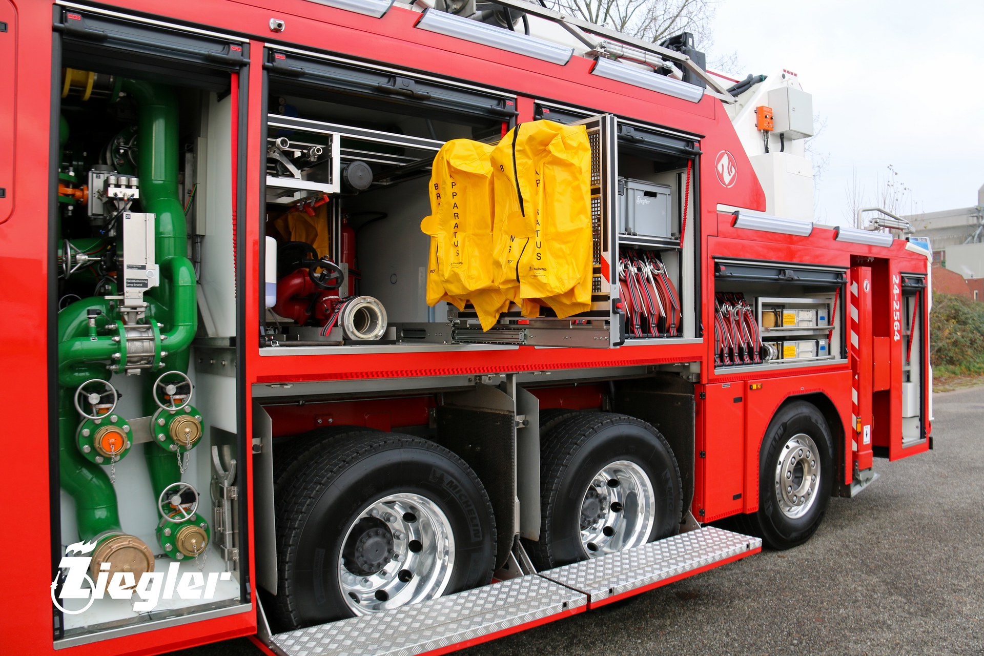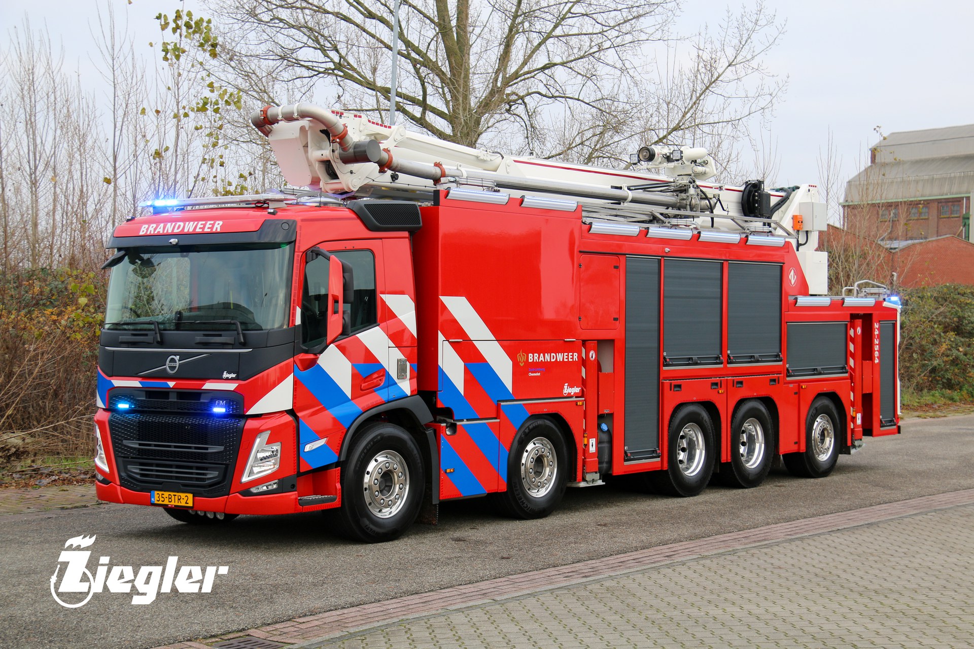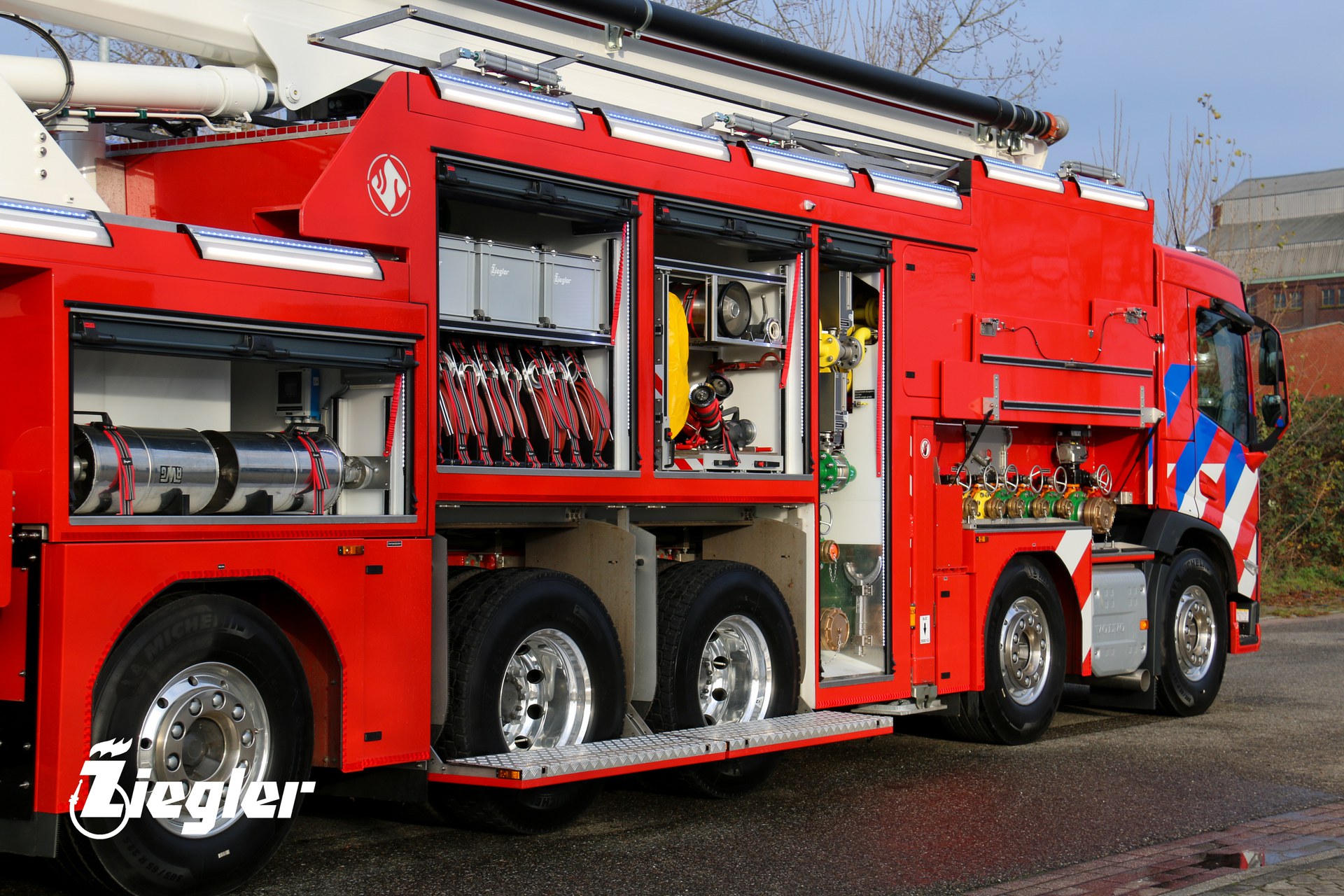 Rik Feijen, Account Manager Ziegler: ‘Met een lengte van twaalf meter is het de grootste schuimblusser die wij ooit geproduceerd hebben in Winschoten. Hier zijn wij natuurlijk enorm trots op. Het voertuig is voorzien van het Ziegler Z-PF schuimbijmengsysteem. Dit systeem is uniek binnen de brandweerindustrie. Dankzij een speciaal gevormd inspuitpunt en een innovatieve mengbuis is een perfecte schuimbijmenging gegarandeerd, ongeacht het merk, type of viscositeit van het (fluorvrij) schuim. Klaar voor de toekomst dus!