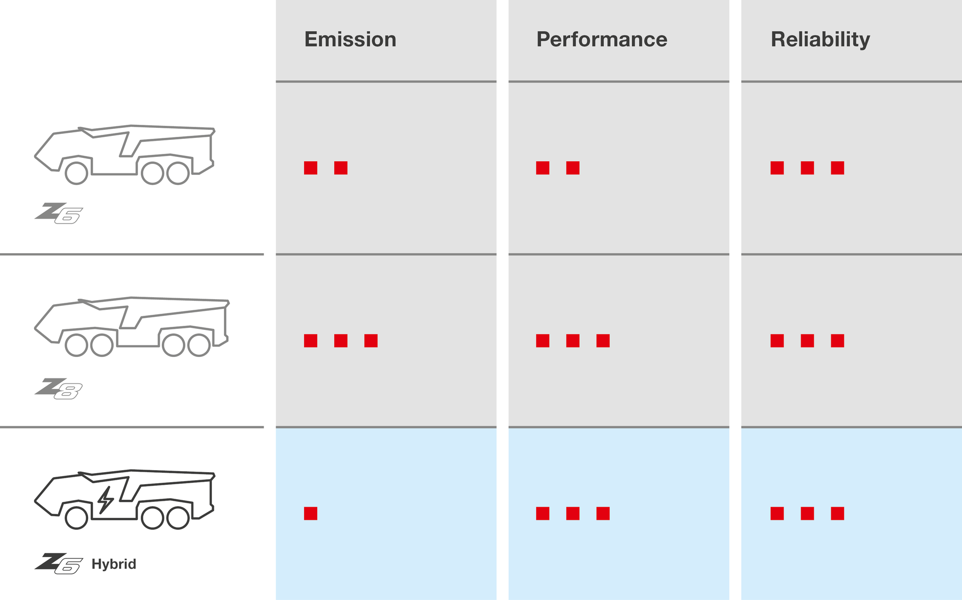 De nieuwe Z6 hybride kan op drie verschillende manieren worden aangedreven; Exclusief met elektromotor, conventioneel met verbrandingsmotor (diesel) of met een hybride aandrijftechnologie. In het laatste geval werken de elektromotor en de verbrandingsmotor hand in hand in een intelligent netwerk.